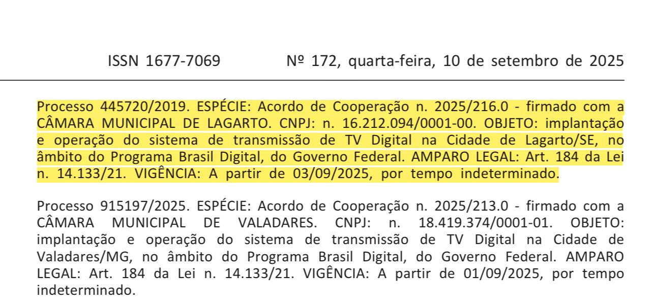Câmara de Lagarto firma acordo para implantação do sistema de transmissão de TV Digital